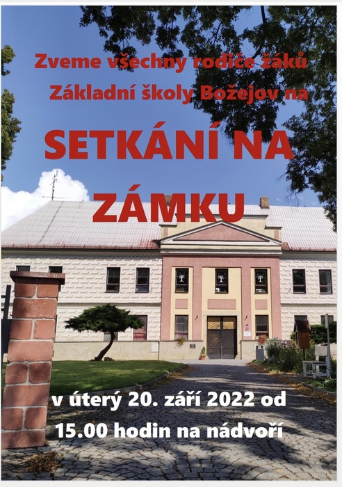 Zveme všechny rodiče žáků Základní školy Božejov na setkání na zámku, které se bude konat v úterý 20. září 2022 v 15.00 hodin na nádvoří zámku.